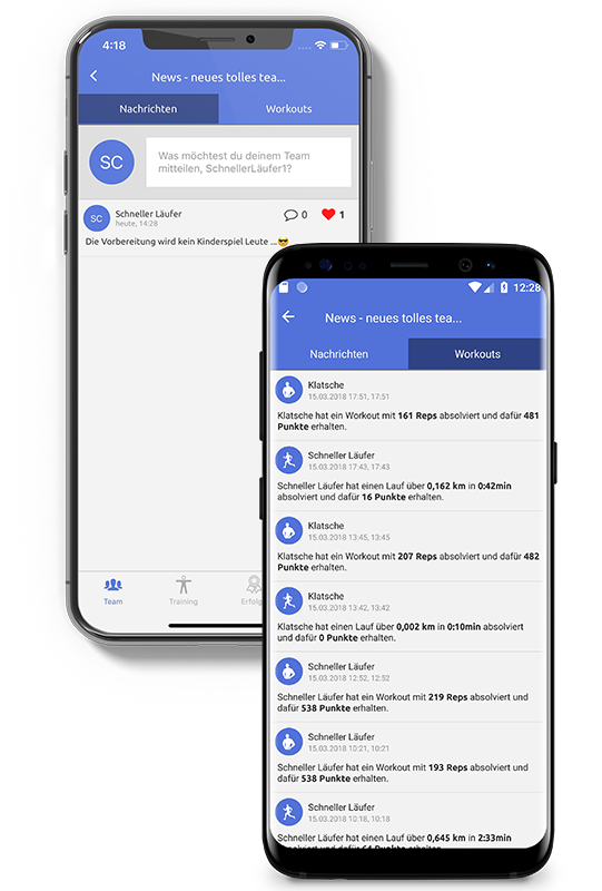 Communicate with your players about the teamfit team wall. Write messages, which can be commented and liked. With the messages you can motivate everyone in the team or tell them something important. In addition, the News tab also shows the sporting activities of all team members.